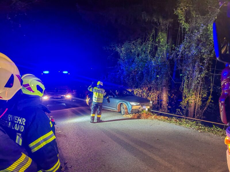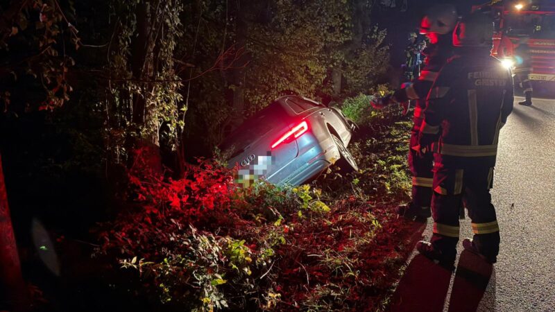 Beim Eintreffen der Einsatzkräfte wurde der PKW sofort gegen ein weiteres Abrutschen gesichert. Der Lenker hatte sich zuvor glücklicherweise unverletzt aus dem Fahrzeug befreien können.