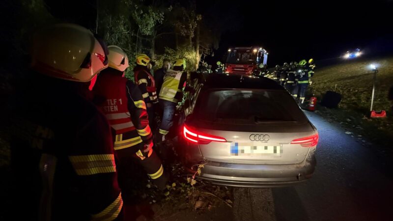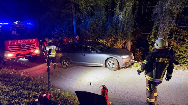 Ein Fahrzeug war von der Straße abgekommen und in eine steile Böschung geraten. Zunächst hieß es, dass das Auto samt Lenker drohe, weiter abzurutschen.