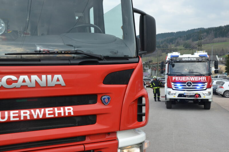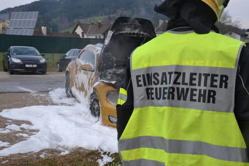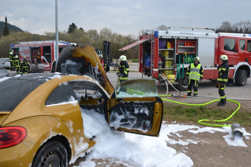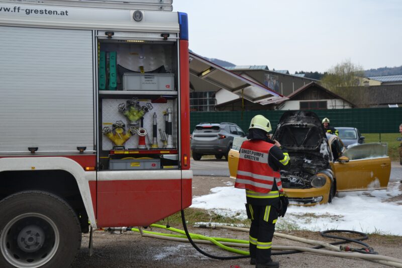 Nur wenige hundert Meter neben dem Feuerwehrhaus geriet ein PKW auf einem Firmenparkplatz in Brand. Kurz nach der Alarmierung rückten zwei Fahrzeuge mit insgesamt zwölf Mitgliedern der FF Gresten aus, um den Brand zu löschen. Bereits bei der Anfahrt war eine starke Rauchentwicklung zu sehen, beim Eintreffen stand der vordere Bereich des Autos in Brand.